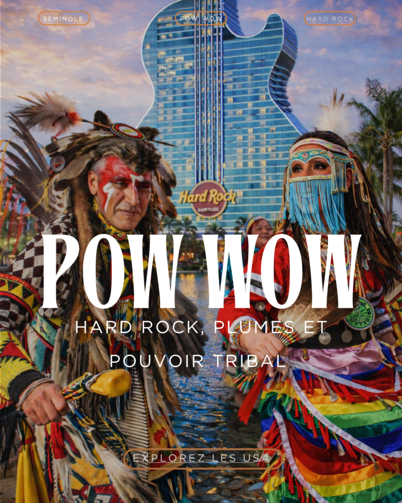Imagine un grand rassemblement de danses et de chants amérindiens, en habits traditionnels, avec tambours qui résonnent, bijoux artisanaux et odeurs de cuir et de maïs rôti… maintenant, place ça au pied d’un hôtel-casino en forme de guitare géante, entouré de néons, de stars, de concerts et de burgers démesurés. Tu ne rêves pas : tu es à Hollywood, en Floride, pour le pow wow des Séminoles au Seminole Hard Rock Hotel & Casino. Et crois-moi, ce choc des cultures, c’est tout sauf un hasard.